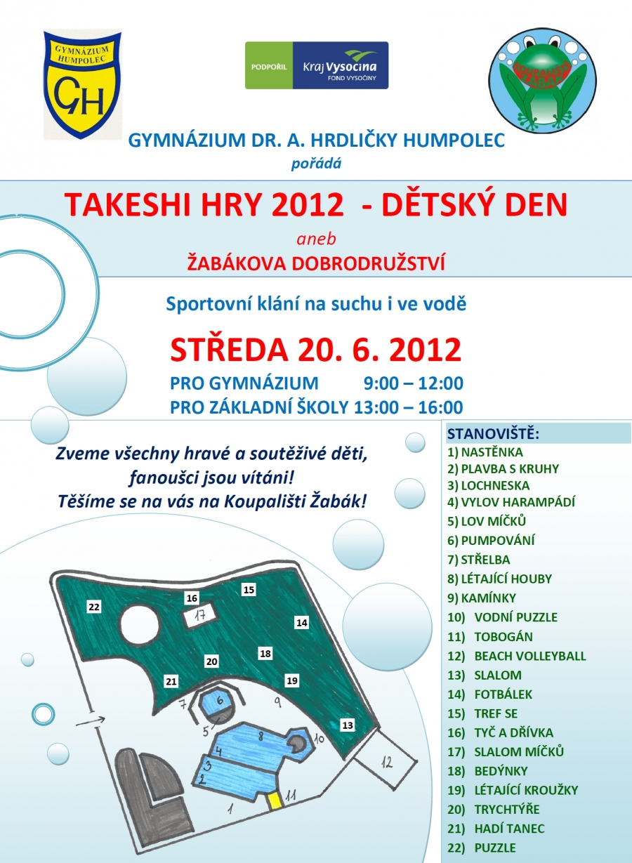 Gymnázium dr. A. Hrdličky Humpolec pořádá ve středu 20. 6. TAKESHI HRY 2012 - DĚTSKÝ DEN aneb ŽABÁKOVA DOBRODRUŽSTVÍ. Čeká na Vás sportovní klání na suchu i ve vodě. Zveme všechny hravé a soutěživé děti, fanoušci jsou vítáni!