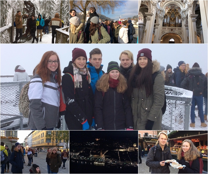 Dne 7. 12. 2017 se 55 němčinářů z naší školy zúčastnilo exkurze do německého Pasova se zastávkou v Bavorském lese na Stezce v korunách stromů. Počasí vyšlo dokonale - v zasněženém Bavorském lese to vypadalo jako v zimní vánoční pohádce, Pasov nás zase přivítal teplotami nad nulou, sluníčkem a modrou oblohou. V Pasově po krátké procházce podél soutoku řek Dunaje a Innu následovala návštěva Muzea skla, kde je možno prohlédnout si celkem 30 tis. exponátů z celé Evropy z let 1650 - 1950, po krátké procházce centrem města a zastávkou v překrásné Katedrále sv. Štěpána všechny nadchnul místní vánoční trh. Před odjezdem jsme se s Pasovem rozloučili pohledem na osvícené město z pevnosti die Veste Oberhaus, která se tyčí nad Dunajem.