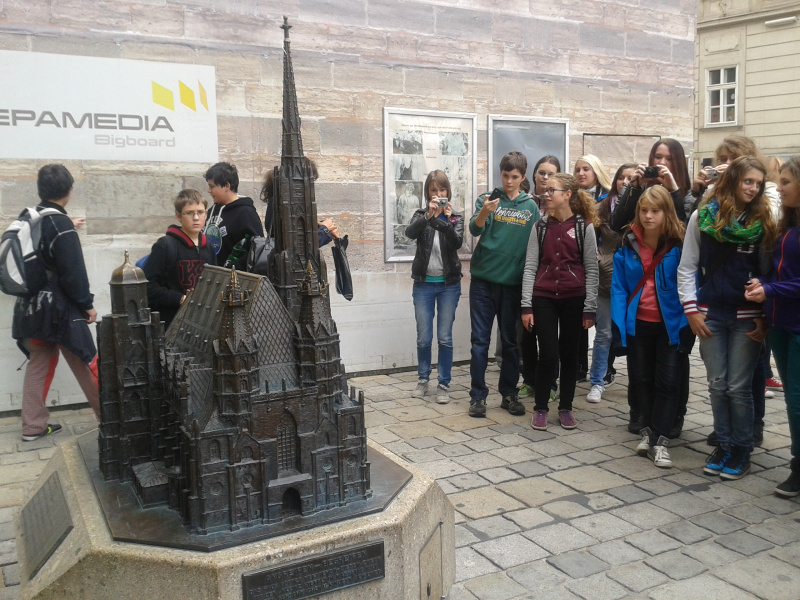 Dne 24. 9. 2013 se v rámci výuky německého jazyka uskutečnila exkurze do hlavního města našich jižních sousedů – do Vídně. Studenti navštívili historické centrum města a jeho nejvýznamnější památky – bývalé císařské (dnes prezidentské) sídlo Hofburg, gotickou katedrálu Stephansdom nebo budovu radnice. Dále měli možnost obdivovat stavitelské umění světoznámého rakouského architekta Friedensreicha Hundertwassera – jeho Hundertwasserhaus svými barvami a tvary zaujme jistě každého návštěvníka. Část odpoledne byla věnována atrakci, na kterou se většina účastníků těšila nejvíce – vídeňskému zábavnímu parku Prátru, kde se mohl každý vydovádět podle libosti na pouťových atrakcích, nebo jen v klidu posedět na lavičce či u stánku s občerstvením a pozorovat dění kolem sebe. Na závěr si studenti vychutnali pohled na Vídeň z ptačí perspektivy z vyhlídkové věže Donauturm, která se nachází na Dunajském ostrově a ze které je možné spatřit celé město doslova jako na dlani. Zážitky jistě umocnilo také nádherné slunné a teplé počasí, ve které jsme při ranním odjezdu z uplakaného a chladného Humpolce už vůbec nedoufali.
