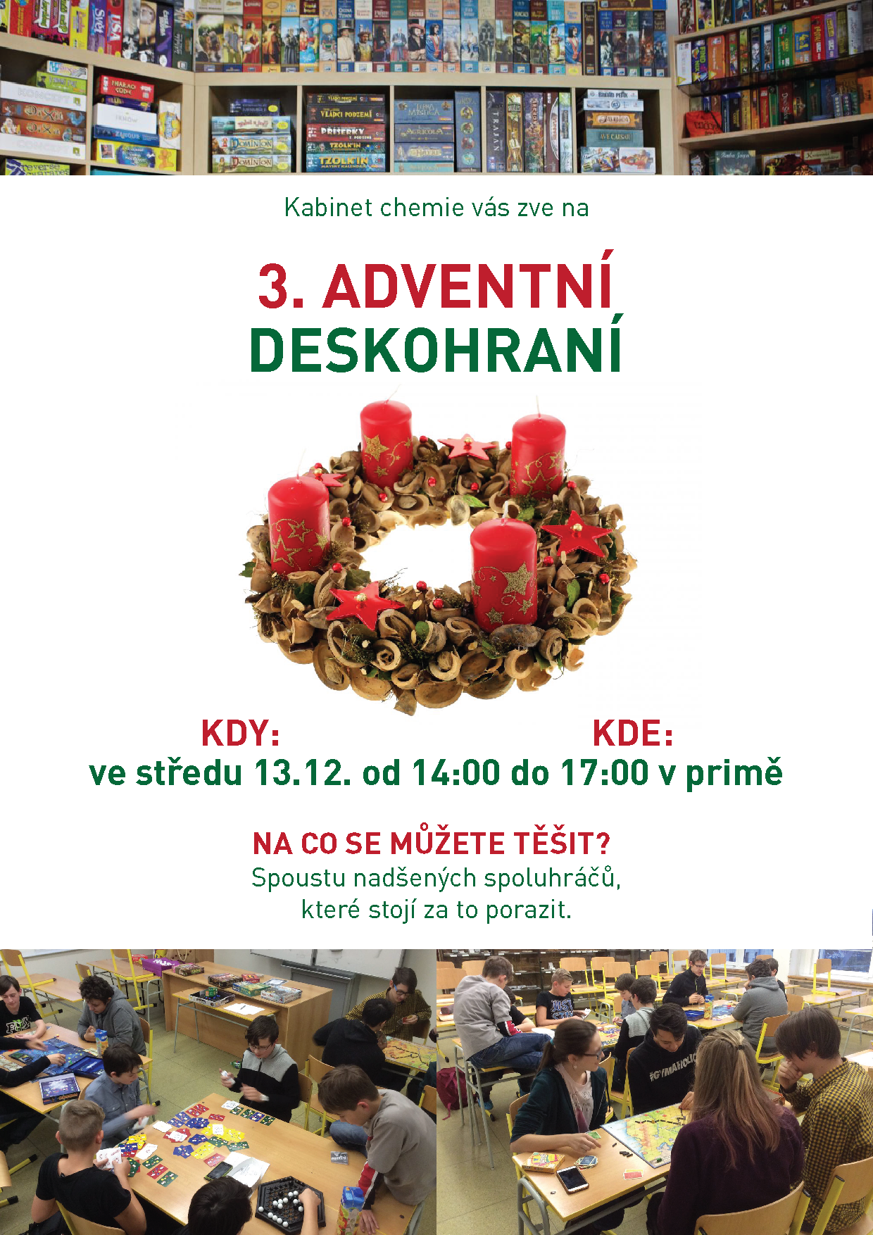 středa, 13 prosinec 2017 | Napsal(a) Mgr. Eva Moravcová | Rubrika Celoškolní akce3. ADVENTNÍ DESKOHRANÍ