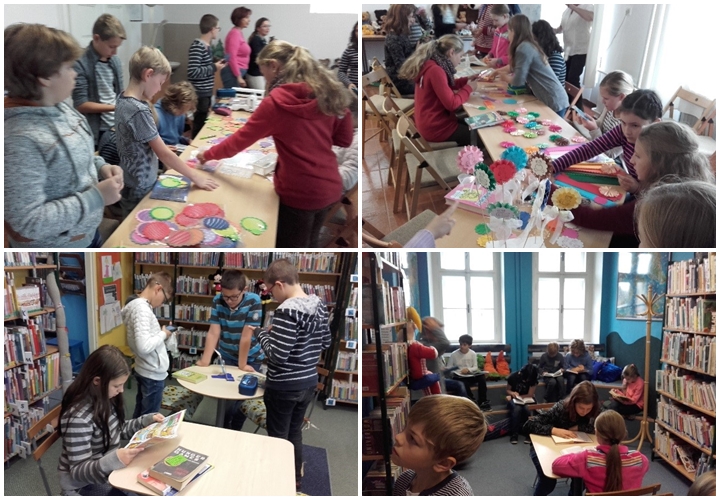 Městská knihovna v Humpolci našim nejmenším čtenářům nabídla prohlídku s doprovodným programem. Taková nabídka se neodmítá, takže i my jsme ji rádi přijali a 5. října navštívili prostory knihovny. Paní knihovnice nám připravily pestrý soutěžní program, po kterém následovala prohlídka knihovny a „medvídkování“. Tedy vyrábění podložek a záložek s motivy medvídků pod vedením paní lektorky. Každý student primy si tak odnesl několik svých výrobků. Také si mohl bezplatně zařídit či prodloužit průkazku do městské knihovny.