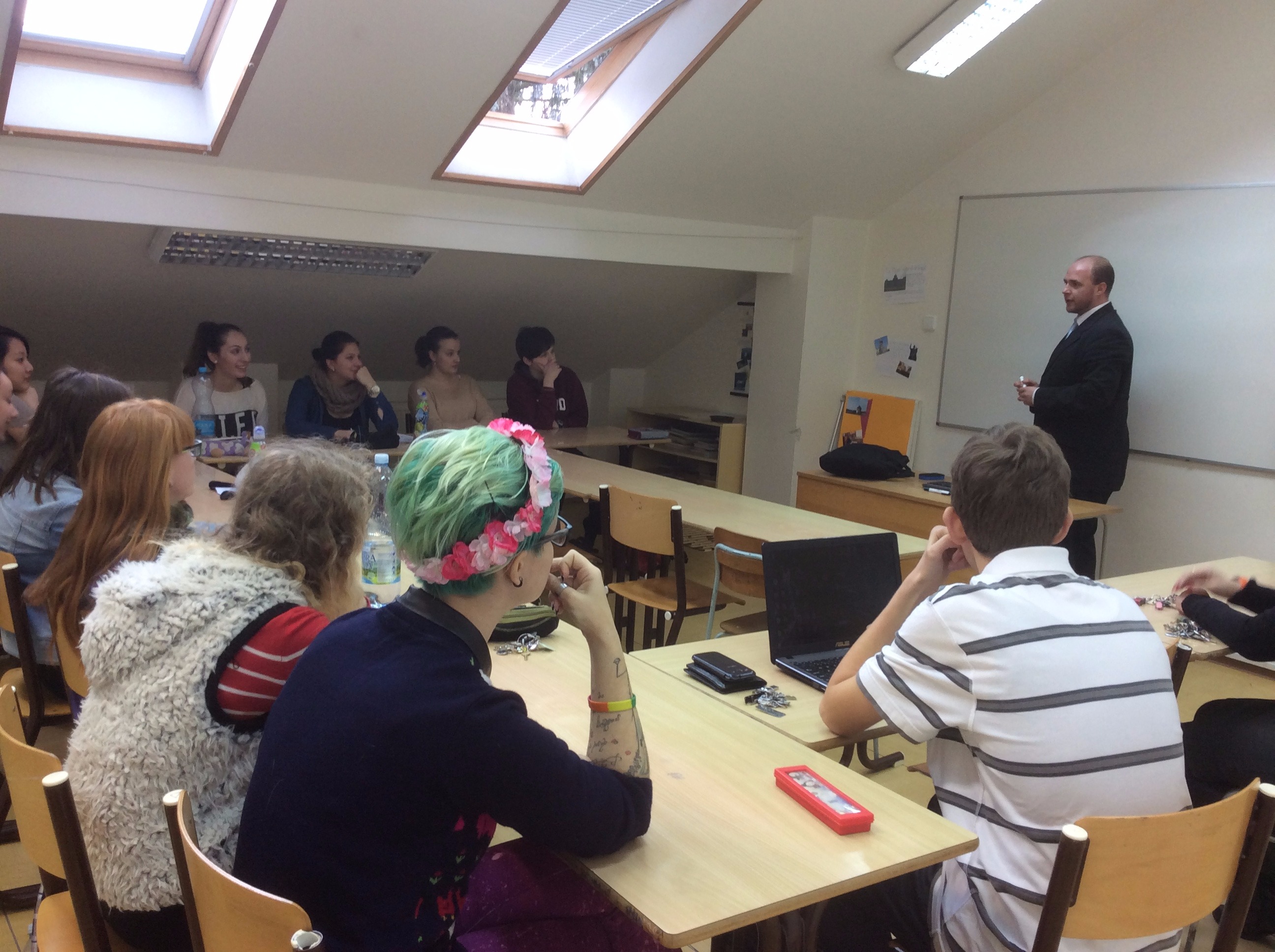 Studenti francouzského jazyka mají nyní každý měsíc možnost konverzačních hodin s francouzským lektorem kraje Vysočina Nicolasem Singier. V pátek 19. února se s ním tentokrát setkali žáci tříd tercie, kvarty, kvinty, sexty, oktávy, 2.A a 4.A. Žáci tercie si dokonce pro Nicolase připravili otázky týkající se denního režimu a studentky kvinty mu představily svůj projekt „Notre agence de voyages“. S maturitními ročníky lektor probral témata vztahující se k ústní maturitní zkoušce – porovnali české a francouzské svátky i rozdíly ve školském systému Francie a České republiky. Studentům se zvolená témata líbila a už teď se těší na příští návštěvu – dokonce si hodiny s rodilým mluvčím dopředu zamlouvají :-).