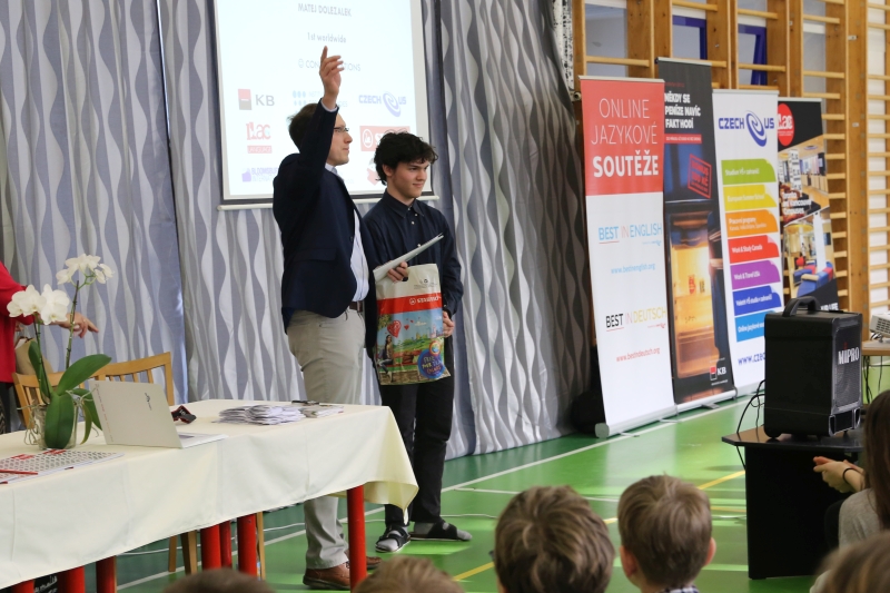 Matěj se sám ke svým znalostem a dovednostem vyjadřuje tak, že je získal především díky tomu, že téměř veškeré informace konzumuje výhradně v angličtině. Jeho vyučují Ivana Taičmanová se smíchem okomentovala průběh jejich výuky. „Ráda bych řekla, že se jedná o vzájemné obohacování, ale mám spíš pocit, že co se týče jazyka, Matěj už mnohdy obohacuje spíše mě než já jeho,“ uvedla Taičmanová. Gratulujeme Matějovi, ale i všem ostatním studentům, kteří se soutěže zúčastnili a reprezentovali naši školu – děkujeme. :-)